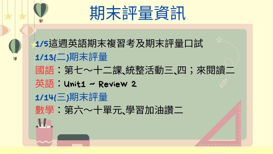 練習聖誕歌曲https://www.youtube.com/watch?v=6Cot10ipI54&list=RD6Cot10ipI54&start_radio=1 英文期末評量範圍: U1~Reveiw2 1/5這週考期末口式和期末複習卷 |